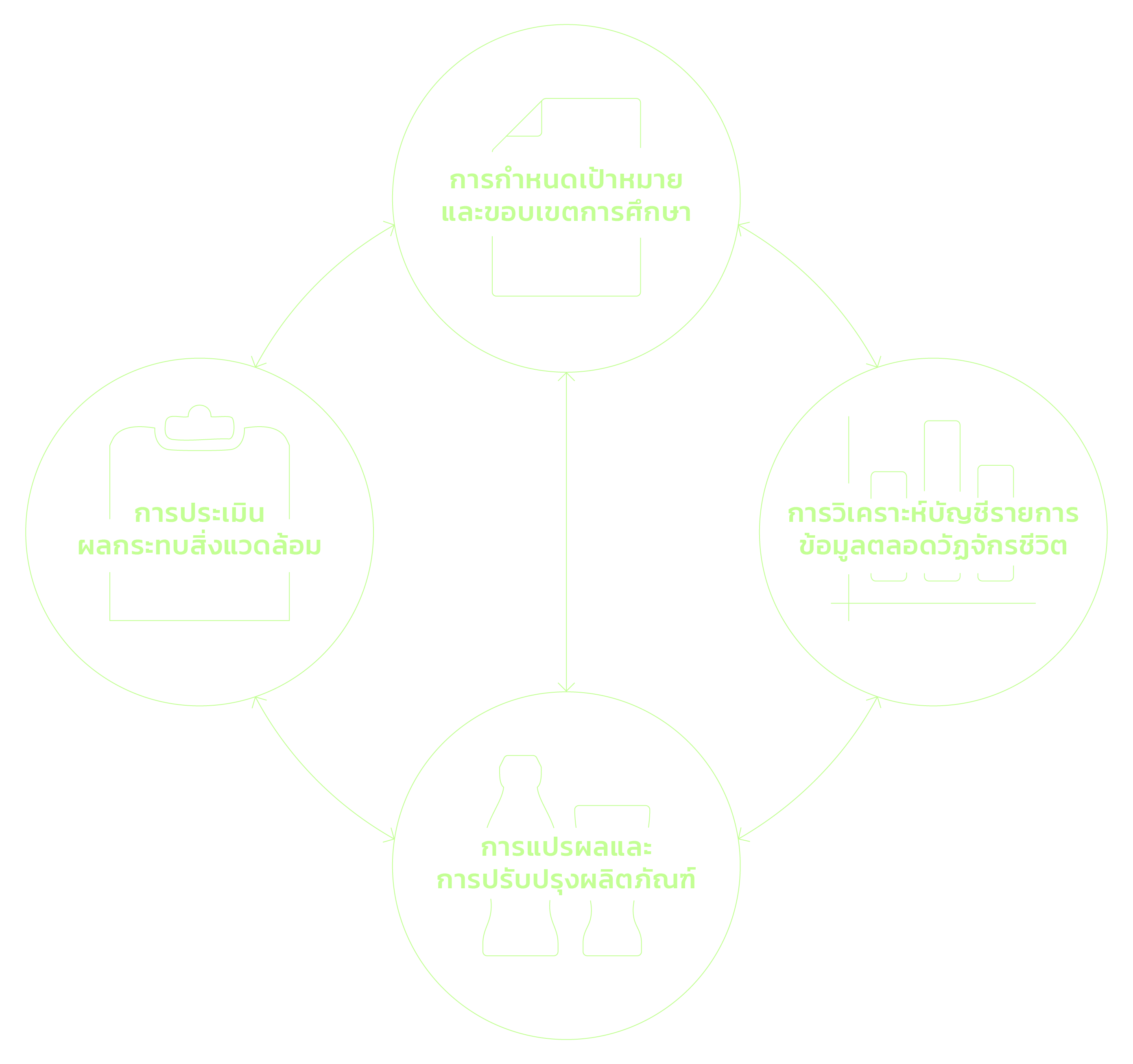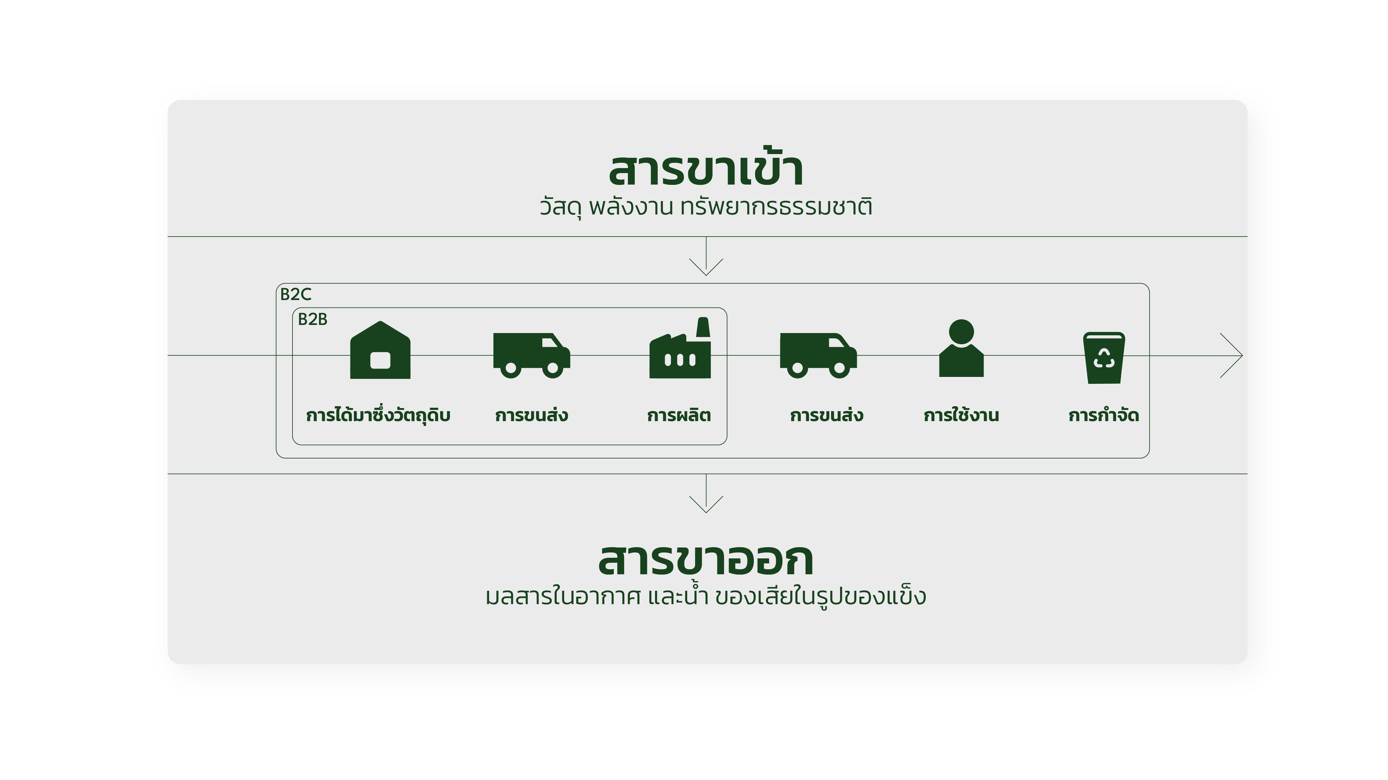 ตั้งแต่การได้มาซึ่งวัตถุดิบ กระบวนการผลิต/การประกอบชิ้นงาน การกระจายสินค้า การใช้งาน และการจัดการของเสีย